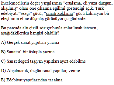C ŞIKKI İpucu: Cümlede “eleştiri” hakkında açıklamada bulunulmaktadır. Bu parçada eleştiri, sadece belli kurallara bakmakla, sezgiye dayanmamakla yeriliyor. Bu da sanatla ilgili güçlü bir farkına varmanın olmaması demektir. Buna en yakın anlam C seçeneğinde verilmiş. | |